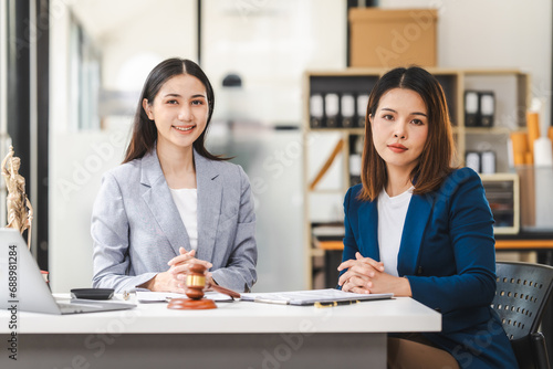Two middle aged and young Asian lawyer in a formal suit consoles a client during a legal consultation, with a gavel and documents on the table.