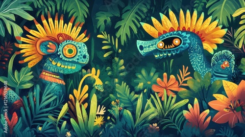 Two Ornate Creatures Converse Amidst Lush Tropical Foliage