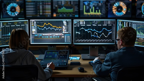 Two people analyze data on multiple computer screens