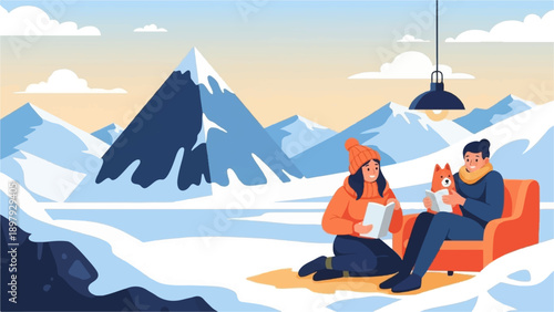 Two people and a dog read books in a snowy mountain landscape