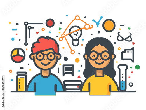 Two people are smiling and wearing glasses. They are surrounded by various science-related objects such as a book, a cup, a bottle, and a clock. Concept of curiosity and learning