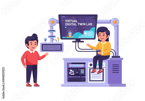 Two people interacting with a virtual digital twin lab interface on a large monitor