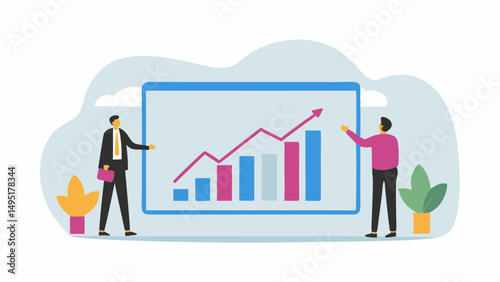 Two people presenting a graph with upward trending line and bars on a screen in a light setting