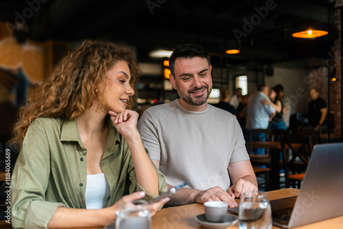 Two people sit at a table in a cafe working on a laptop while enjoying drinks