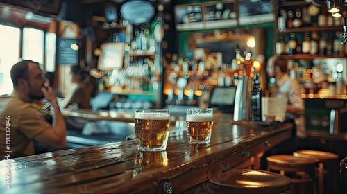 Two people sitting in pub at bar counter and drinking craft green traditional beer, cider. Selective focus. Blurred.