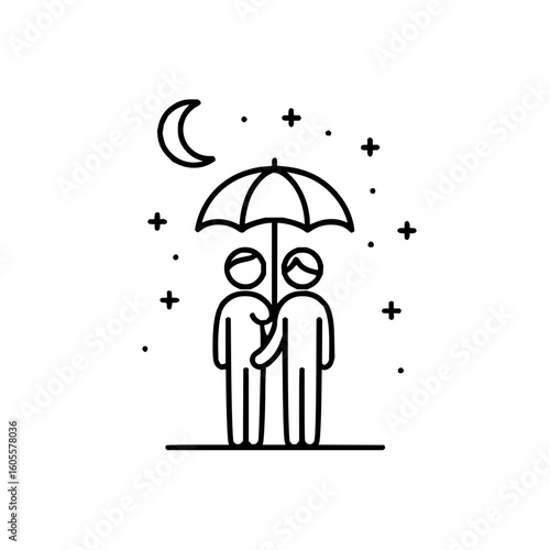 Two people standing together under an umbrella with a crescent moon and stars in a black and white line drawing