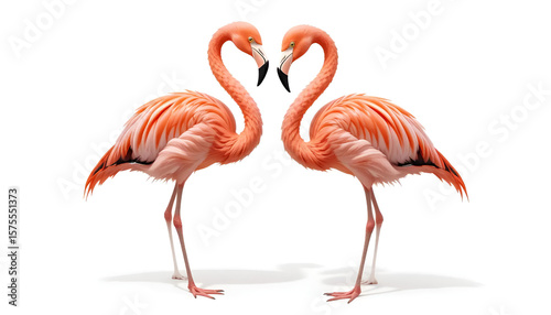Two pink flamingos standing together against a white background. Graceful birds with long legs and curved necks, ideal for nature, wildlife, or tropical-themed design projects.