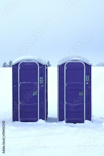 Two porta potties, or mobile toilets, in the snow sitting side by side. A deep blue or royal purple color.