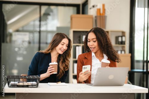 Two professional caucasian with african american businesswoman friends collaboration, working together at office, using laptop, Generally accepted audit standards, Earnings before interest and taxes