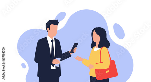 Two professionals engaging in a digital discussion, with one holding a smartphone and coffee, representing modern communication and networking.