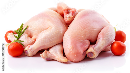 Two raw chicken legs with tomatoes and rosemary on a white background