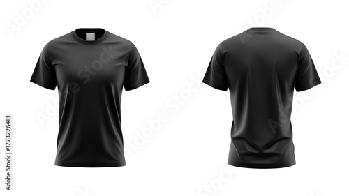 Two realistic 3d rendered black t shirts front and back views displayed on a transparent background for easy design customization isolated on transparent background