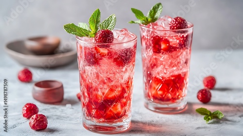 Two Refreshing Red with Ice, Raspberries, and Mint on a Textured Grey Table
