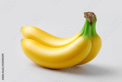 Two ripe yellow bananas with green stems arranged close together on a neutral gray surface