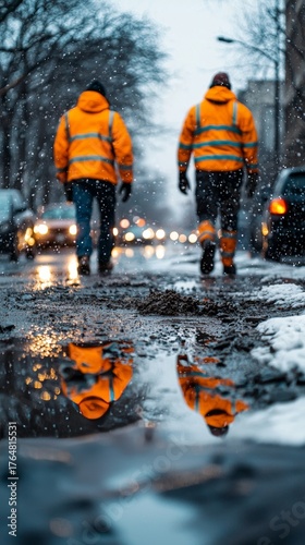 Two Road Workers in High Visibility Jackets Walking on a Snowy Urban Street with Puddles Reflecting Light and Figures During Winter