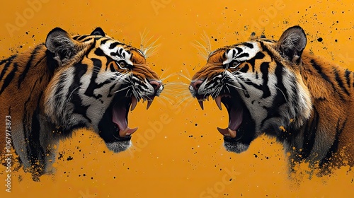 Two roaring tigers in a bright yellow background add dynamic energy to this aggressive big cat scene, ideal for posters or banners.