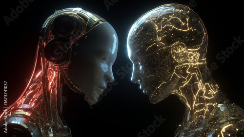Two robotic figures engage in a silent confrontation showcasing advanced artificial intelligence concepts