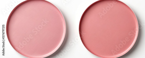 Two round pans of pink blush isolated. Make-up cosmetic product for cheek, face application. Portable beauty accessory tool. Feminine, smooth shade for fashion, contour kit.