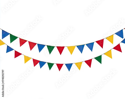 Two rows of colorful triangle flags strung on a thin cord, against a plain white background
