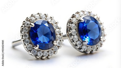 Two sapphire and diamond earrings are laying on a white reflective surface