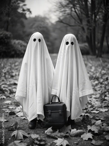 Two Scary Halloween ghost in floating white cloth in the middle of dark forest