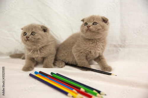 Two Scottish kittens are playing with pencils on a white background.
