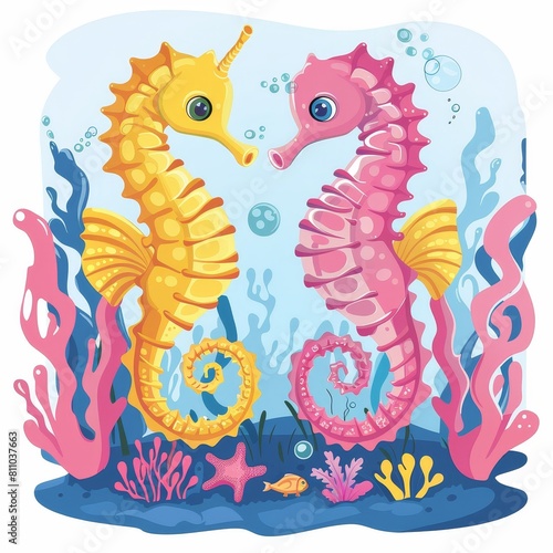 Two seahorses are swimming in the ocean