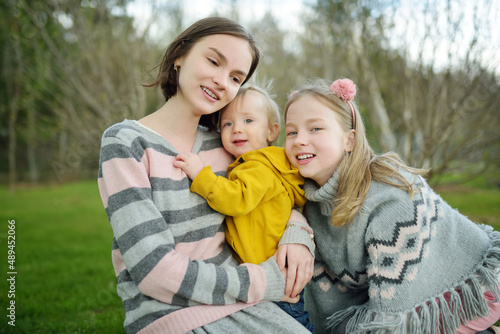 Two sisters and their toddler brother having fun during a hike in the woods on beautiful sunny spring day. Active family leisure with kids.