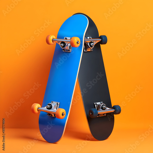Two skateboards leaning against an orange wall with a warm glow