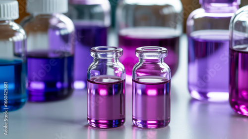Two small glass vials filled with purple liquid laboratory scientific