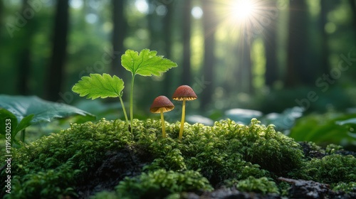 Two Small Mushrooms Growing In Mossy Forest Sunlight