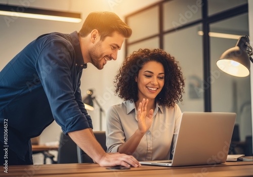 Two smiling colleagues collaborating on a laptop in a modern office