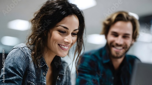 Two smiling coworkers collaborate while looking at a computer screen in a modern office