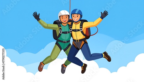Two smiling figures in flight suits, secured by harnesses, float mid-air with hands raised, against a blue sky with clouds