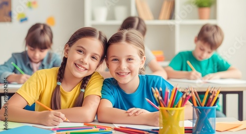 Two smiling schoolgirls with friends in background, colorful pencils on desk, classroom setting, learning and friendship