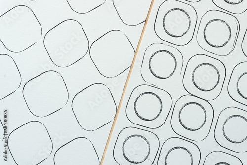 two sorts of abstract sketchbook paper with black ink circles in rounded corner squares arranged diagonally on wood
