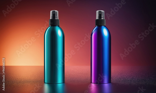 Two spray bottles, one teal and one purple, sit on a reflective surface against a colorful background
