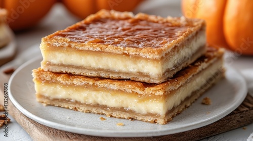 Two stacked caramel custard slices with flaky crusts, creamy layers, and glossy caramel topping, served on a white plate with a rustic background.