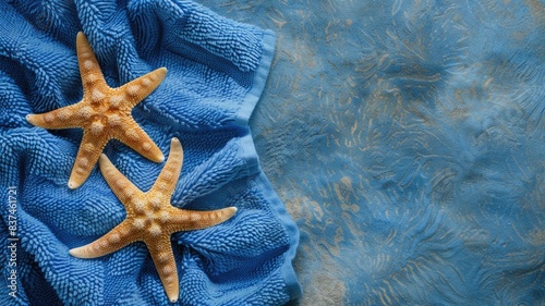 Two starfish on blue textured fabric background, evoking coastal vibe