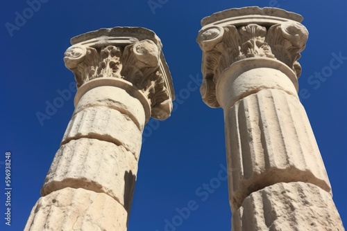 two stone pillars with carved faces against a blue sky. Generative AI