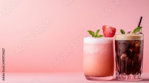 Two stylish drinks featuring fresh strawberries garnished with mint, presented against a soft pastel background, creating a fresh and inviting visual appeal.