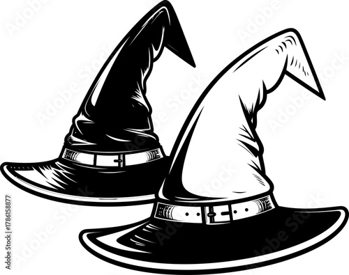 Two stylized witch hats, one black and one white, displayed in a simple graphic illustration.