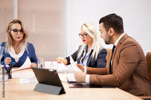Two successful business women and one businessman at the desk. Team of business people at meeting in the conference room. They are discussing new projects