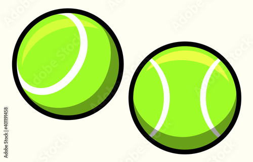 Two tennis balls from different angles. Simple cartoon illustration of sports equipment. Green balls with shadow and light. Icon and logo for fitness tournament, championship or competition.