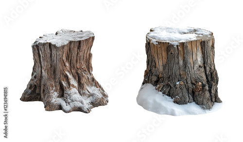 Two Tree Stumps Covered in Snow, Isolated on Transparent and White Background