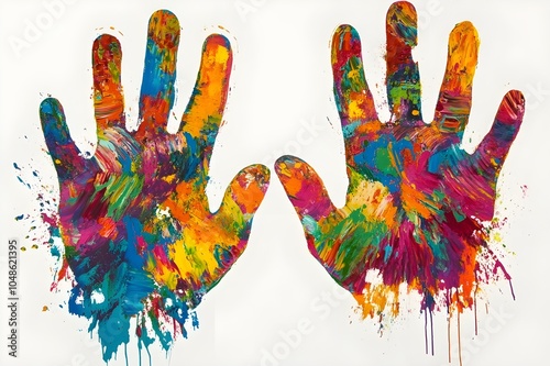 Two vibrant, colorful human handprints on a pristine white background