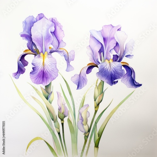 Two violet purple watercolour iris spring summer flower illustration on white backdrop. Floral blossom concept