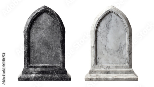 Two weathered tombstones, one gray and one marble, stand isolated on transparent background, evoking a sense of history and solemn remembrance