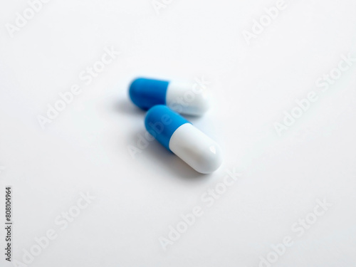 two white and blue medicine capsules close-up