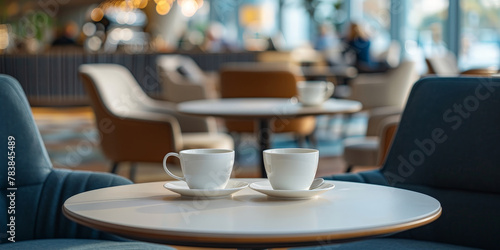 two white coffee cups on a empty table in cafe or restaurant